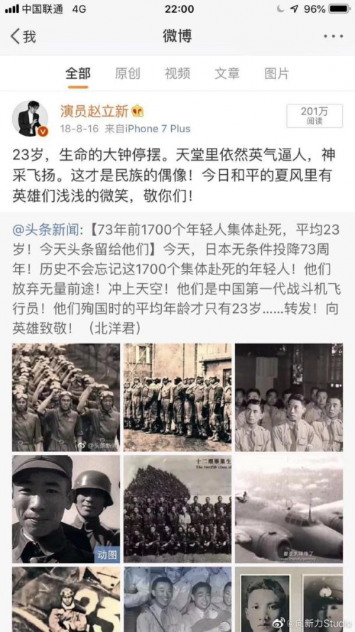 而大众也似乎在强大的质疑声中遗忘了赵立新也曾是一个积极的抗日分子,他出演过诸多抗日爱国剧,也在微博发表过诸多抗日爱国的言论:“今日和平的夏风里有英雄们浅浅的笑”,“细菌战的罪恶会成为侵略者的斑点,永远抹不去”。